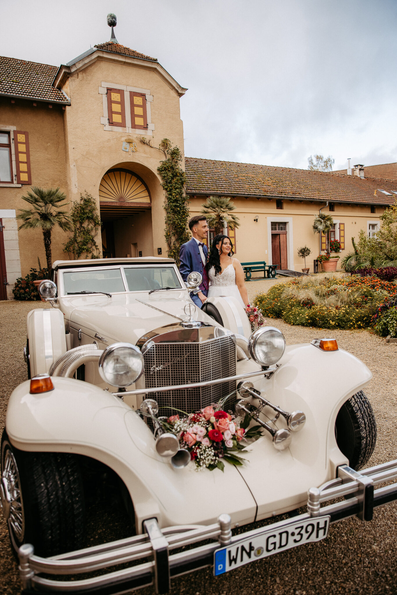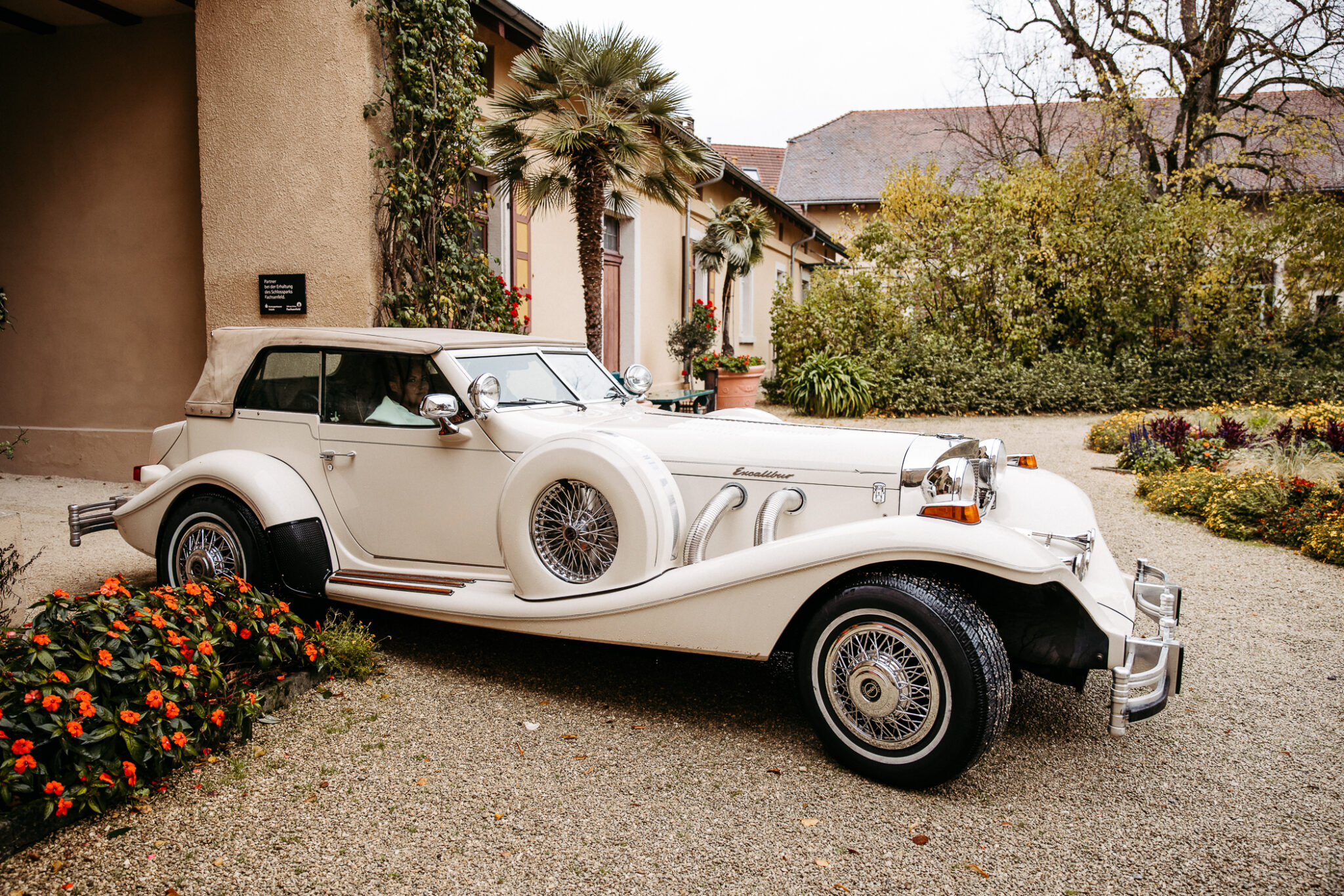 Die Ankunft des Brautpaares beim Schloss war ein besonderer Moment. Stilvoll vorgefahren im eleganten Oldtimer.