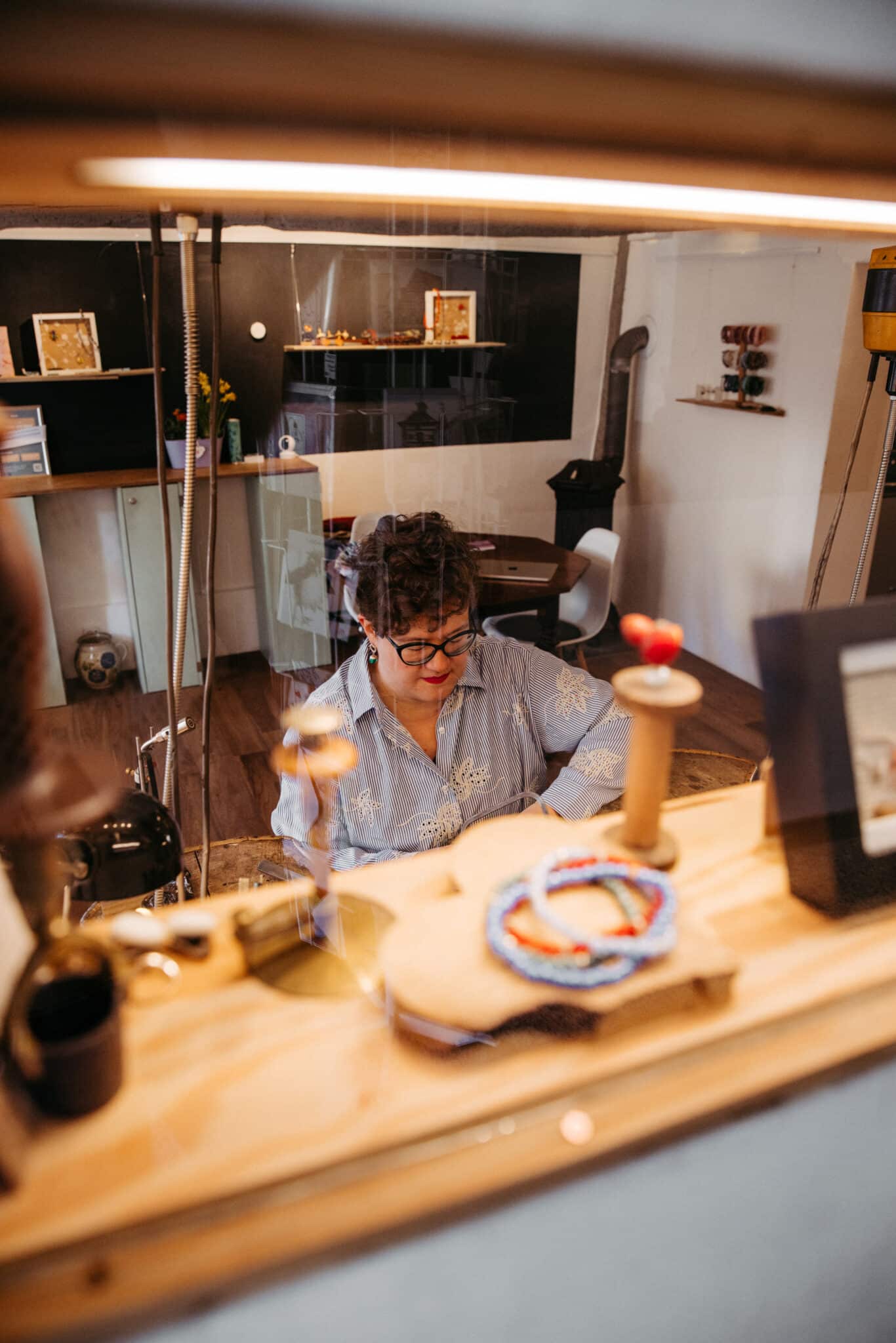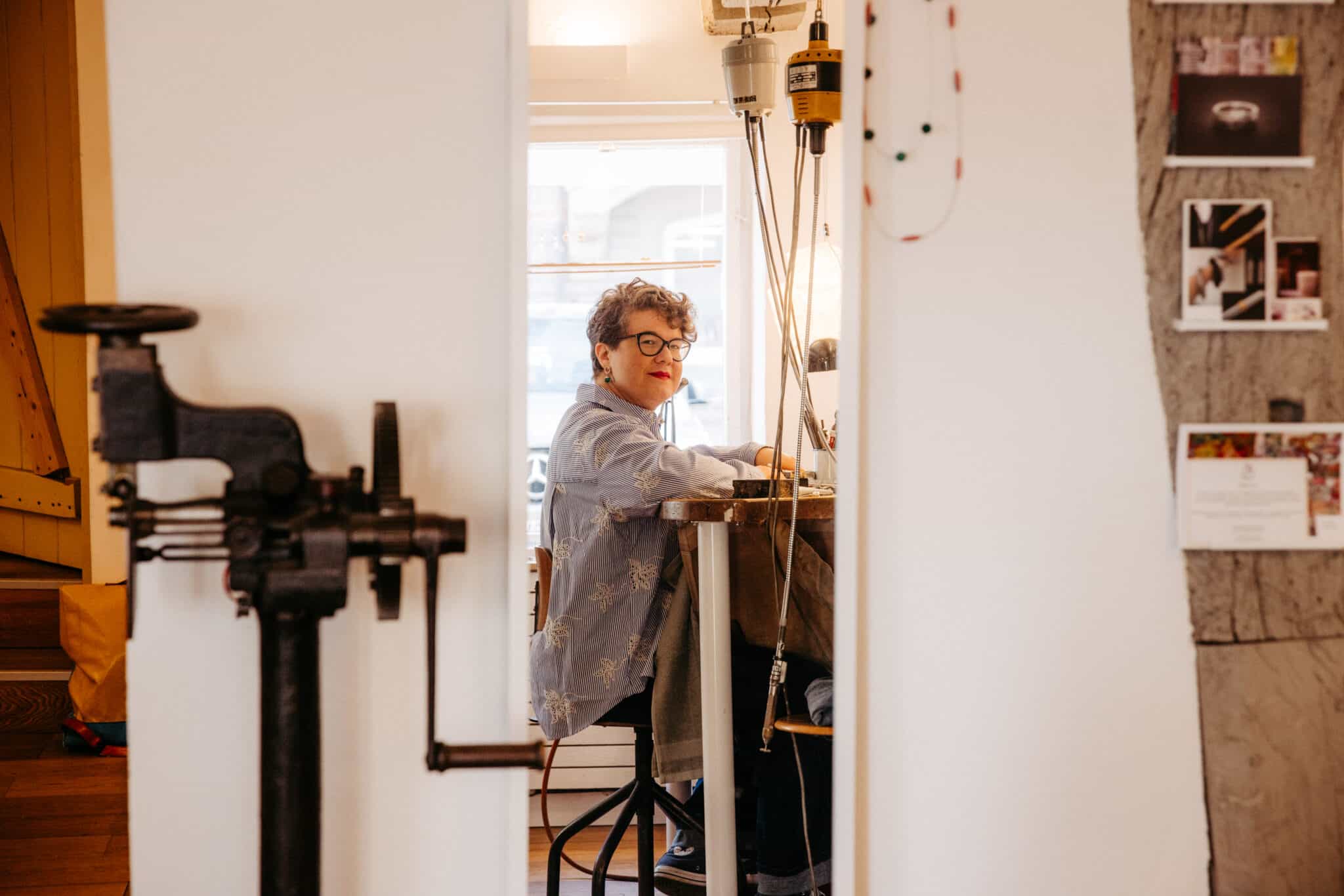 Der Name einblick 36 kommt übrigens nicht von ungefähr. Bei ihr kann man wirklich durch mehrere Fenster reinspickeln. Der Beratungsraum und die Werkstatt sind total stimmig in einem Raum untergebracht. Man steht quasi mitten in der Werkstatt – näher dran geht´s kaum.